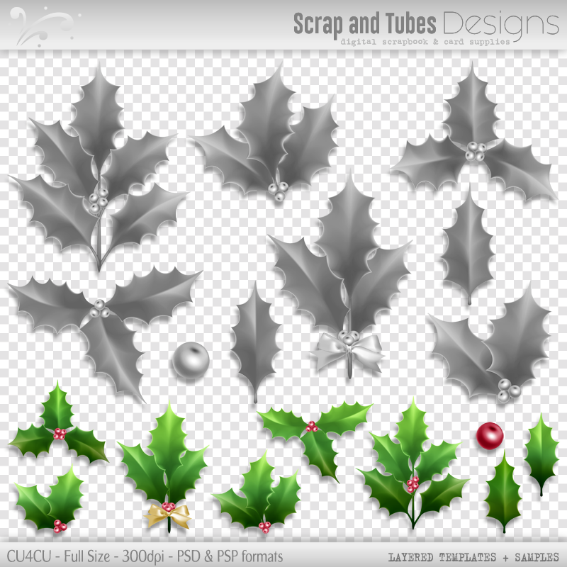 3 grayscale elements (2 X holly leaf + berry) - ready for you to be colorized!