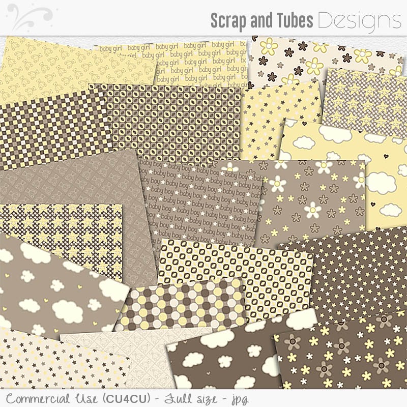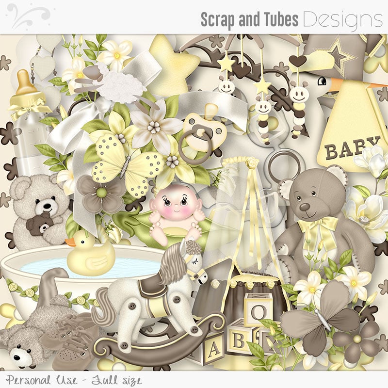 Babies, cradle, mobile, toys, plush bears, rocking horse, bath set, baby pea pods, teething ring, stork, bib, pacifier, bottle feeding, baby shoes, pram, girl blocks, boy blocks, romper, dress, moon, clouds, sheep, butterflies, heart string, stars, buttons, safety pins, tags, flowers, bows, frames and papers.
