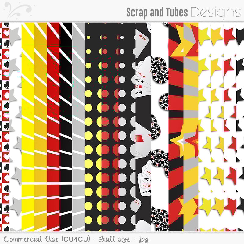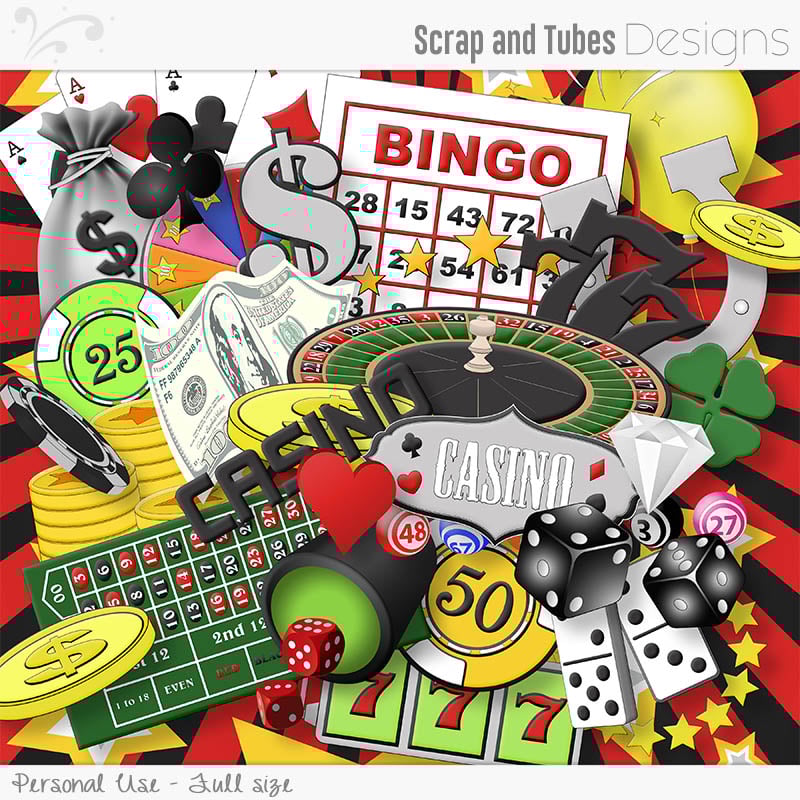 Gambling dices cup, Roulette mat, Roulette Wheel, Money, Coins, Money symbol, Lucky 7, Bingo card, Bingo balls, Wheel of fortune, Slot machine elements and fruits, Poker chips, Money bag, Dices, Signs for Casino, Card shapes (club ♣ diamond ♦ heart ♥ spade ♠), Cards, Domino, Slot machine, Stars, Balloons, Confetti and streamers, frames, Casino wordart and Papers