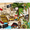 Ship, Pirate boy, Treasure chest, Spade, Palm tree with monkey, Ship wheel, Treasure map, Skull flag, Barrel, Parrot, Sword, Hook, Cannon, Bomb, Compass, Pistol, Bottle, Hat, Eyeglass, Anchor, Isle,Palm trees, Lamp, Sign board, Torch, Ropes, Sun, Cloud, Starfish, Crab, Seashells, Dragonfly, Bird, Waves, Lot of flowers, Bows, Frames and Papers.