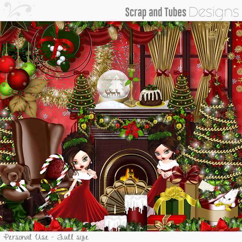 2 ladies, Fireplace, Leather arm chair, Cabinet, Christmas tree, Stair, Window with curtains, Curtain, Rocking horse bear, Gifts, Candles, Christmas pudding, Santa hat, Tinsel wreath, Christmas star, Santa boot poinsettia, Jingle bells, Kitten gift box, Christmas balls and bells, Branches, Snow globe, Santa moon, Snowflake confetti, Mistletoe, Christmas swags, Stocking, Candy canes, Poinsettia flowers, Lights, Horn, Snowflake, corner ornament, Tags, Bows, Frames and Papers.